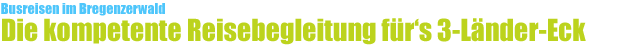 ![]() ![]() ![]() enn Sie Busreisen mit Wellnessaufenthalten anbieten oder nach einem REISEBEGLEITER mit einem unterhaltsamen Unterhaltungsangebot suchen, so sind Sie hier genau richtig.Gerne begleite ich Busreisende während des Aufenthaltes in VORARLBERG und biete neben REISEBEGLEITUNGEN auch entsprechende Rahmen-Veranstaltungen an. Dabei gibt es zwei Möglichkeiten mich zu buchen. Einerseits als REISEBEGLEITER bei Tagesfahrten im 4-Ländereck Süd-Deutschland - West-Österreich - Ost-Schweiz - Fürstentum Liechtenstein, verbunden mit einen stimmungsvollen Unterhaltungsangebot. Andererseits als REISELEITER bei Wellness-Reisen mit einem unterhaltsamen und professionellen Gesundheitsbildungsangebot nach Bad Bük/Ungarn. Die aktuellen Termine finden Sie unter der Rubrik »TERMINE« und hier darf ich folgende Programme kurz präsentieren: Gerne und mit Freude begleite und betreue ich Reisegruppen aus Deutschland, Schweiz und Österreich, welche in VORARLBERG und speziell im Bregenzerwald eine sehr eindrucksvolle Naturkulisse vorfinden und wo Brauchtum, Tradition und bedeutende Persönlichkeiten Zuhause sind bzw. waren. Mit großer Leidenschaft vermittle ich während den Fahrten die kulturellen und geschichtlichen Hintergründe, bei denen die Gäste wissenswertes und sehenswertes erfahren und gleichfalls einen stimmungsvollen Ausflugstag erleben. Nachdem die Gitarre mein ständiger Begleiter ist, sorge ich für gute Stimmung während den Busfahrten, wie auch im Rahmenprogramm mit "Liedern, die das Leben schreibt". Das 4-Länder-Eck mit Österreich, Schweiz, Fürstentum Liechtenstein mit Vaduz und Deutschland bietet sich mit der KäseStrasse Bregenzerwald für bodenständige und sehr schöne Ausflugsfahrten rund um den Bodensee (Insel Mainau), sowie zahlreiche weitere Attraktionen an. Für jeden Reisenden werden die Tagesausflüge zu einem besonderen Erlebnis, da durch meine Ortskenntnisse viele interessante Details vermittelt werden. Zielgruppe: Reisebüros :: Busunternehmen :: Reiseunternehmen :: ... die eine Busreise nach VORARLBERG bzw. in den BREGENZERWALD planen und ihren Gästen ein besonderes Programm bieten wollen; Preis pro Tour: auf Anfrage - separate musikalische Gestaltung des Rahmenprogrammes mit Musik pro Std. auf VB. Bei Wellnessreisen für Reiseveranstalter, Organisationen & Vereine biete ich meine Dienstleistungen als REISEBEGLEITER an. Bei mir erhalten Sie eine kompetente deutschsprachige Reisebegleitung, wo Ihre Gäste auch im Rahmenprogramm durch Wohlfühl-Tipps für den Alltag und mit "Liedern, die das Leben schreibt" begeistert werden. Zielgruppe: Reisebüros :: Busunternehmen :: Reiseveranstalter :: ... welche für ihre Gäste eine spezielle Wellnessreise mit einem besonderen gesundheitsbildenden und unterhaltsamen Wohlfühl-Programm kombinieren wollen. Preis: je nach Dauer |