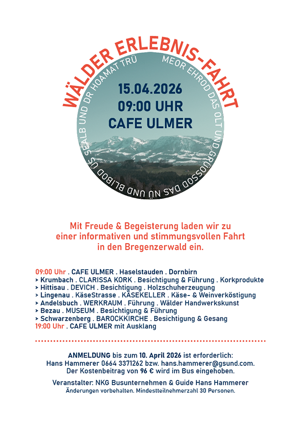 Datum: 15-04-2026 :: Zeit: 9:00 Uhr :: Wo: Abfahrt beim Cafe Ulmer, Haselstauden, Dornbirn