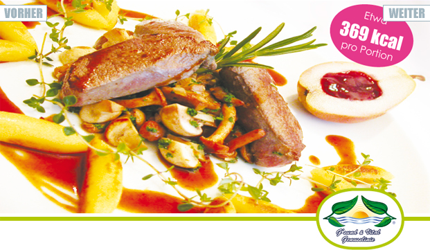 Nun die Pilze in der Mitte des Tellers und die Medaillons darauf anrichten. Anschließend die Schupfnudeln runderherum legen und die Sauce über die Schupfnudeln träufeln. Die Birne dazu servieren und genießen. |